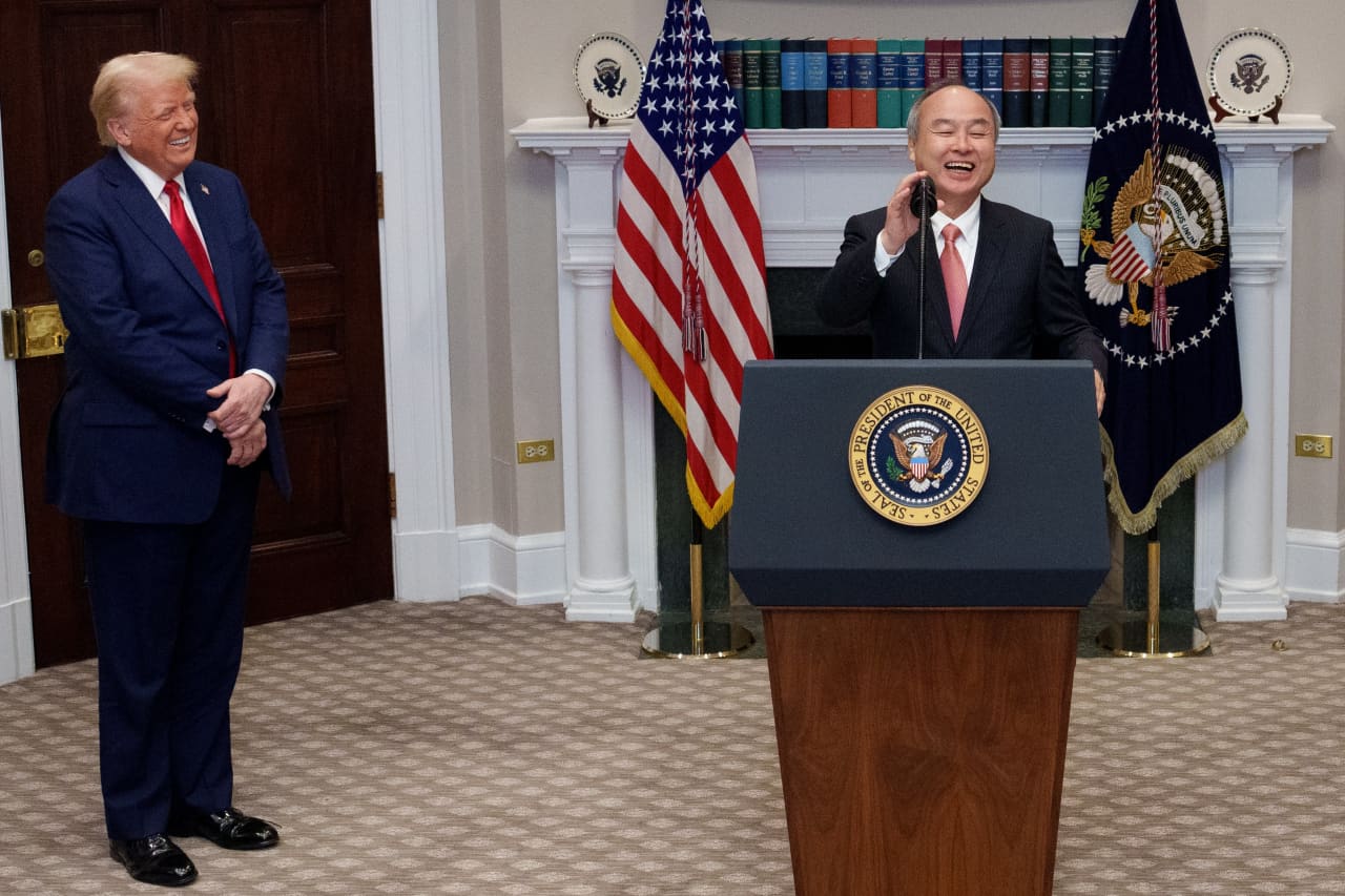 SoftBank shares surged — on five times the previous day’s volume — on Wednesday after the Japanese investment group landed a starring role in an U.S. artificial intelligence infrastructure buildout package backed by President Donald Trump.